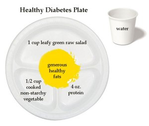 Here is my version of a Healthy Diabetes Plate. There is one section for protein, a section for cooked non-starchy vegetable, and a double section for a leafy green raw vegetable/salad. This is truly a “Whole-Food Plant-Based” plate and it can be Adventist non-vegetarian or vegetarian. Healthy fats are added as required to provide satiety, and certainly can be avocado, olive oil on the salad, butter on the cooked vegetable, etc. And water! Yes, pure water is the ideal beverage.