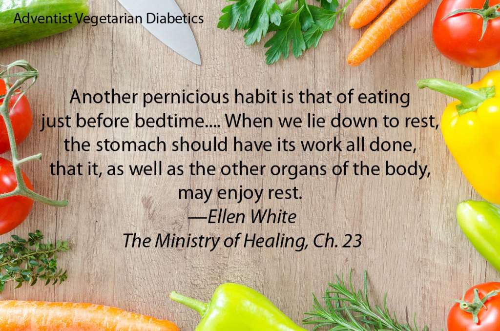 For several years, diabetes nutritionists were recommending eating six small meals a day with the rationale that this practice would keep the blood sugars stable. The reality is that eating that often keeps the digestive organs—including the pancreas—working overtime without a rest! It’s such a relief to know that current nutrition science recommends 3-5 hours between meals and no snacks in between meals. The last meal of the day should be 3-5 hours before bedtime.