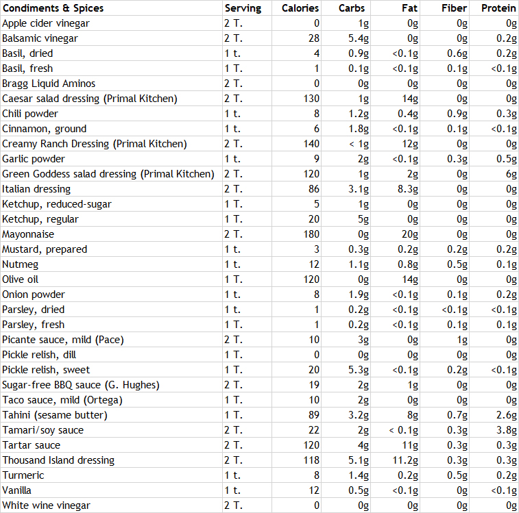 Condiments and seasonings are areas where it’s very tempting to buy ready-made products. If you do, please read the labels carefully! Scrutinize the ingredients list for any forms of sugar (dextrose, maltodextrin, high fructose corn syrup) and any mention of industrial vegetable/seed oils (canola, corn, cottonseed, grapeseed, safflower, soybean, and sunflower oil).